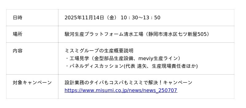 株式会社ミスミグループ本社(本社:東京都千代田区、代表取締役社長:大野龍隆)は、グループ会社である株式会社駿河生産プラットフォーム(本社:静岡県静岡市、代表取締役社長:遠矢工)にて、2025年11月14日、本年7月より実施いたしました「設計業務のタイパもコスパもミスミで解決!キャンペーン」の特賞として、当選者37名を招待した清水工場見学ツアーを実施しました。