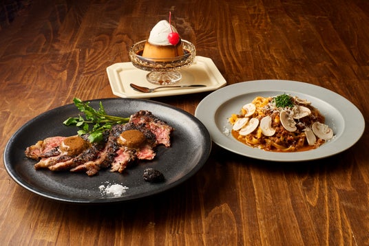 カフェ&ダイニング「IGNITE」熟成牛のブラックガーリックステーキ/IGNITEの濃い味プリン/熟成牛を使ったボロネーゼ タリアテッレ