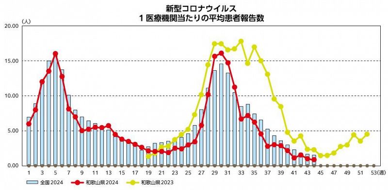 和歌山県は8日、今年第44週(10月28日~11月3日)に定点医療機関で報告された新型コロナウイルスの新規感染者数を発表した。1医療機関当たりの平均患者数は0・90人で、前週1・06人よりわずかに減少した。全国の患者数も前週1・69人から1・57人に減った。