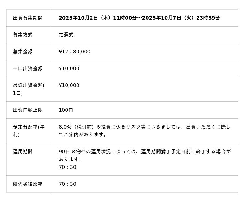 株式会社パートナーズ(本社:東京都港区、代表取締役:吉村 拓、以下「当社」)は、小規模不動産特定共同事業法の電子取引認可に基づき、スマートフォンで1万円から始められる都心の中古マンションに特化したクラウドファンディングサービス「PARTNERS Funding(パートナーズ ファンディング)」Vol.37を組成し、2025年10月1日午前11時よりサービスサイトにて出資の募集を開始します。