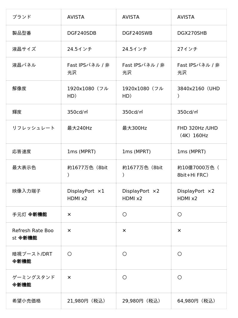 (最大リフレッシュレートはそれぞれ、DGF240SDBは240Hz、 DGF240SWBは300Hz、DGX270SHBはFHD時320Hz/UHD(4K)時160Hz)