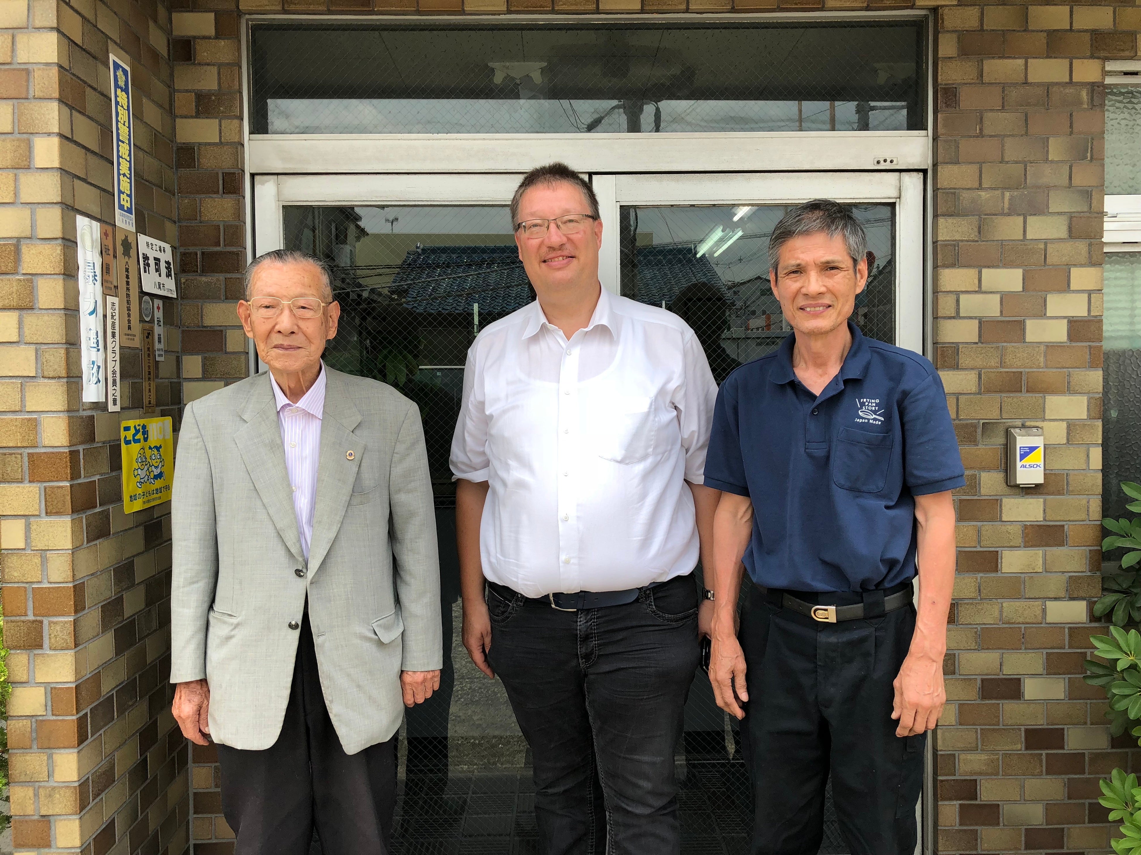 2018年 弊社工場に初来社 (左から弊社創業者、ドイツのハンドルメーカー社長、弊社前会長)