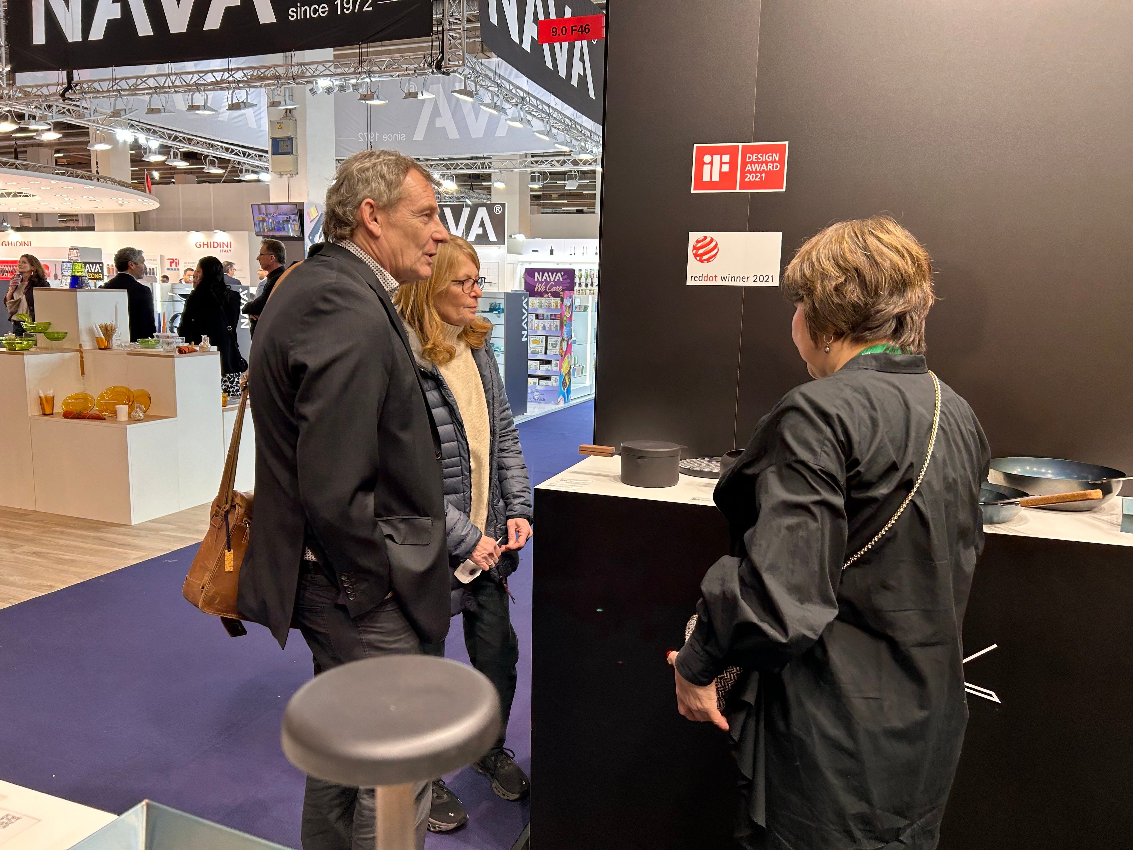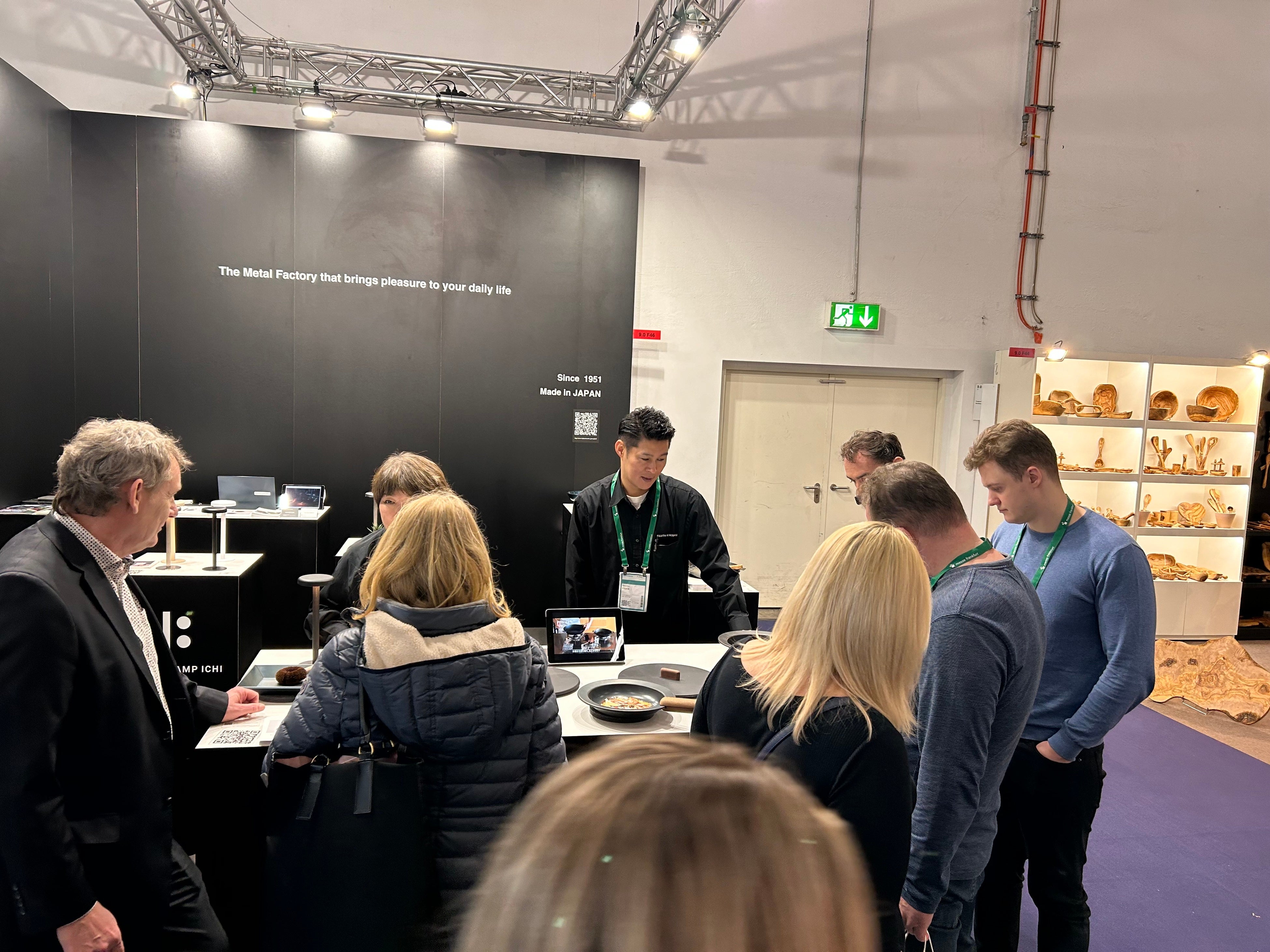 2013年~2018年当時、価格競争、値崩れが激しく利益が薄い状態が続きました。また、新製品を出してもすぐに類似品が出回るという業界構造にも苦しみました。オリジナル商品を強化し、より多くの方々に鉄フライパンを使っていただきたいとの思いを秘め、世界の名だたる調理器具メーカーが出展されているAmbienteへ。そこで創業100年を超える老舗ハンドルメーカーと出会い、展示会会期中にサンプルを製造いただきお取引が始まりました。