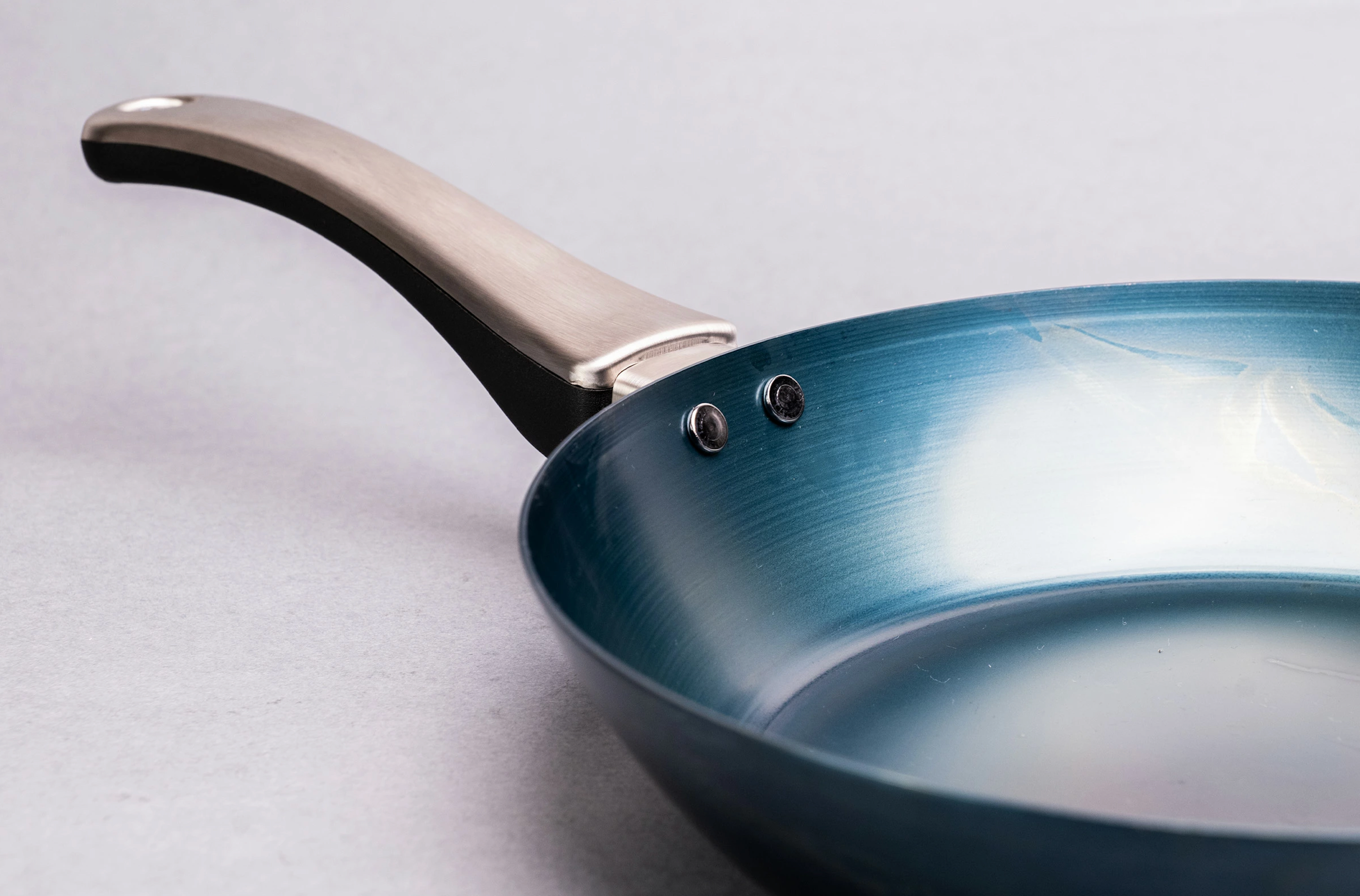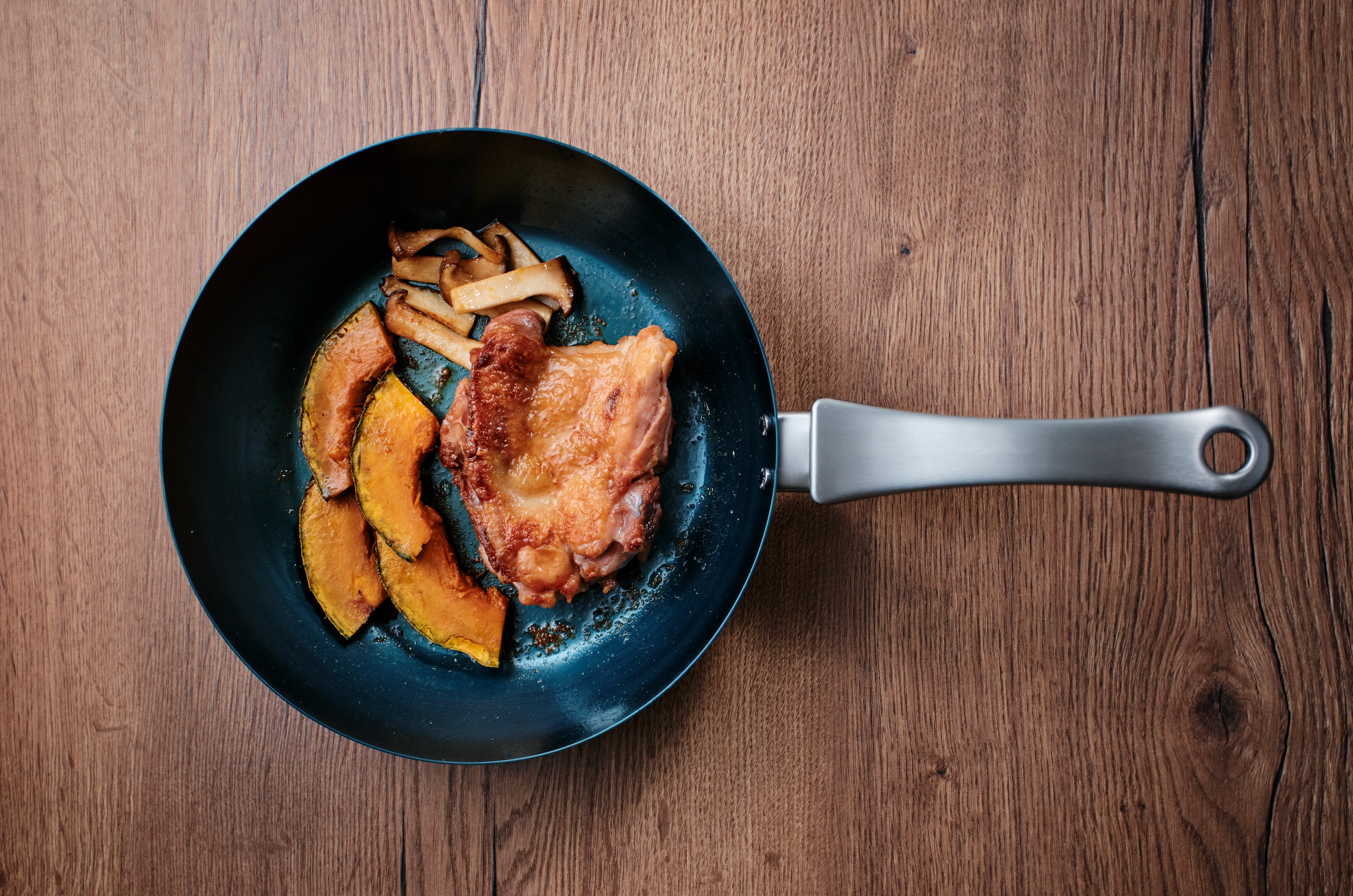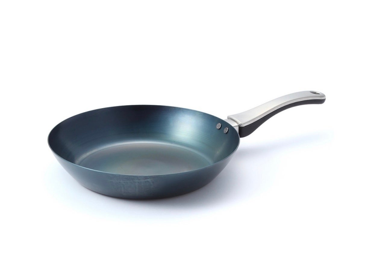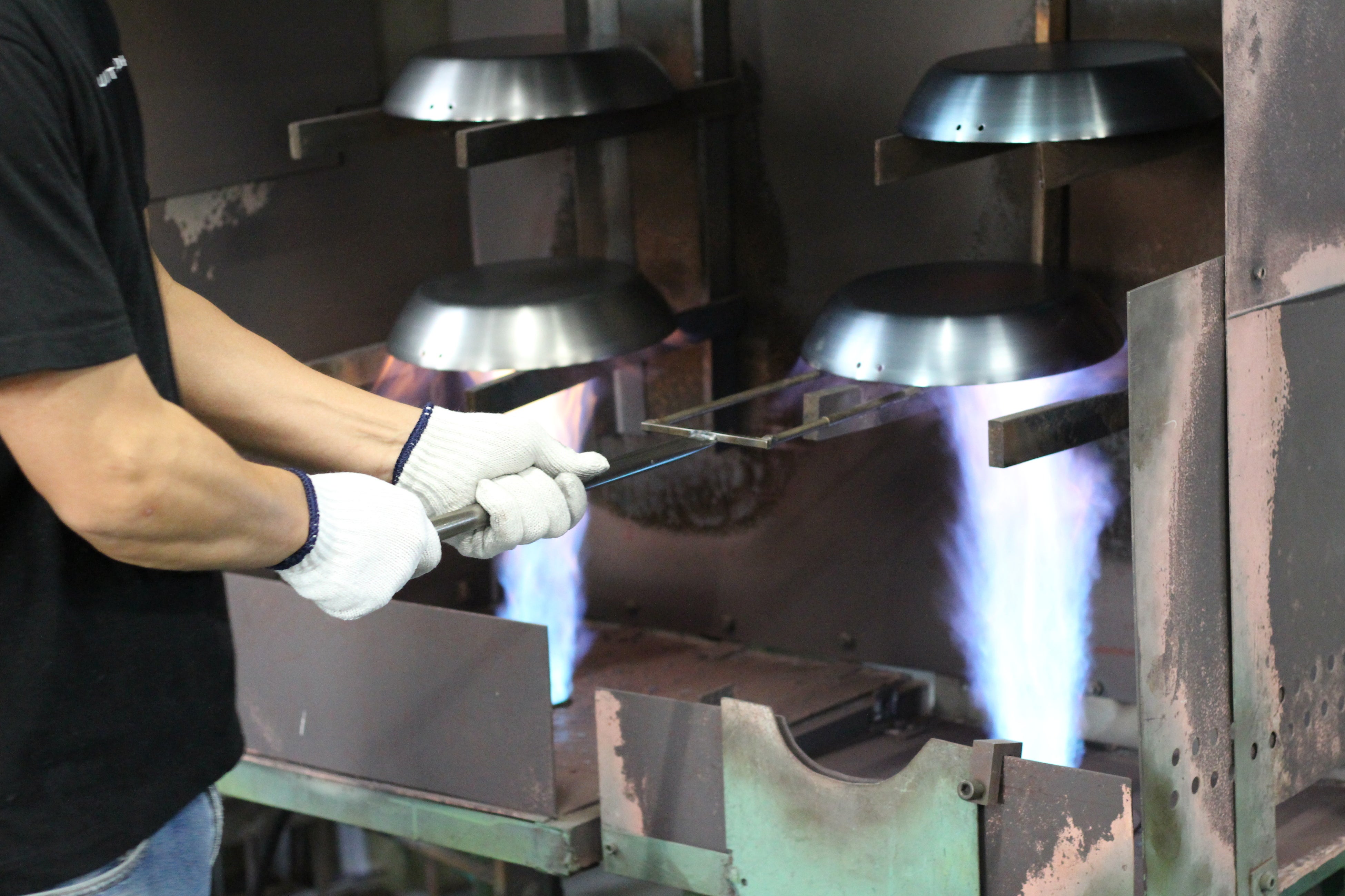 鉄板の温度が700°になるまで高温バーナーで焼きます。一定時間冷ました後、食用のオリーブオイルで馴染ませます。この加工をすることで、通常の鉄フライパンでは必要なご自宅での「油ならし」が不要になります。さらに、ハードテンパー加工をすることで「油ならし不要」に加えて、最初から油も馴染んでおりますので、「焦げ付き」や「こびりつき」「さび」やすさを軽減しております。ご自宅に届いてから、水洗いですぐにご利用いただけます。