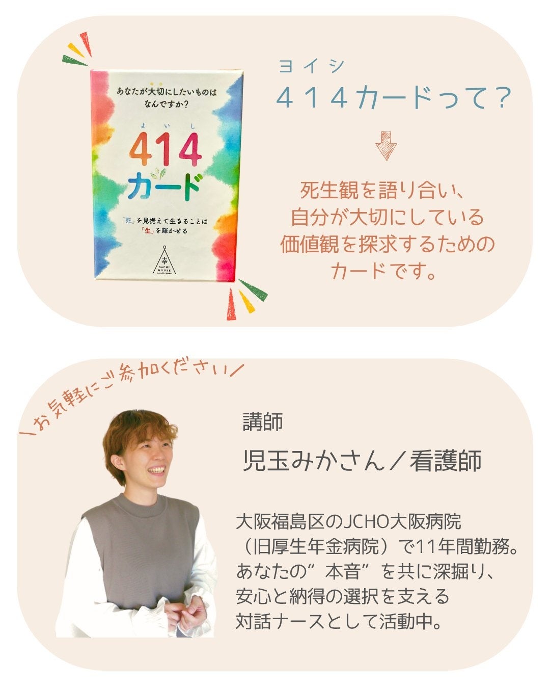 しかし、今回のイベントでは、414(よいし)カードを使いながら、対話ナースでもある看護師・児玉みかさんと一緒に、気軽に語り合います。カードを通して話すことで、意外と笑いあり、気づきありの時間に。