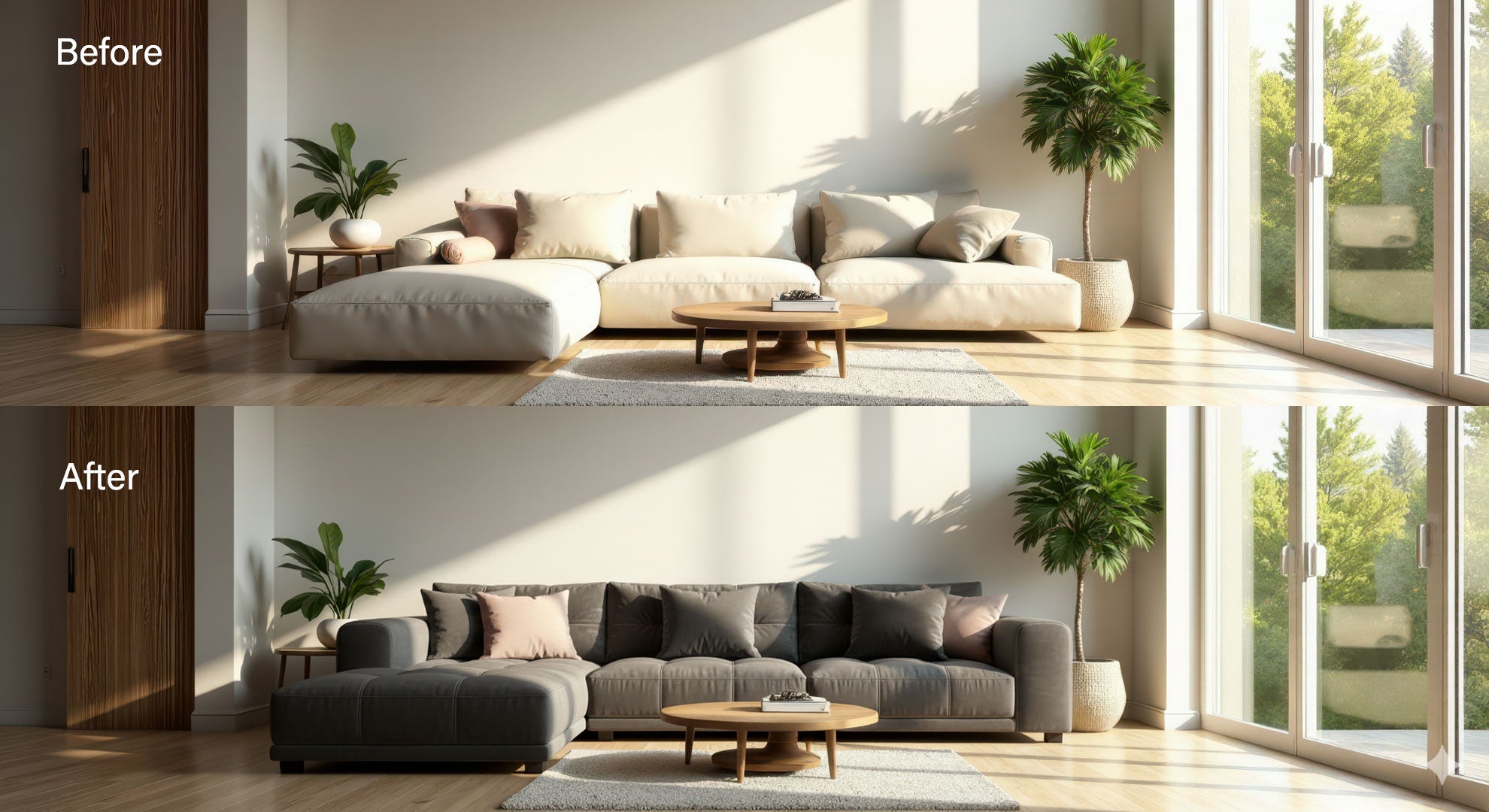 さらに、10月末にはプロンプトに加えて、参照画像をアップロードすることも可能になります。画像の特定のエリアをブラシで選択し、プロンプトで指示する際に、参照画像を追加することで、指定の家具や建材をパース内に合成することが可能になります。これにより、より具体的なリフォーム提案や住宅提案が可能になり、プレゼンテーションの幅が大きく広がります。