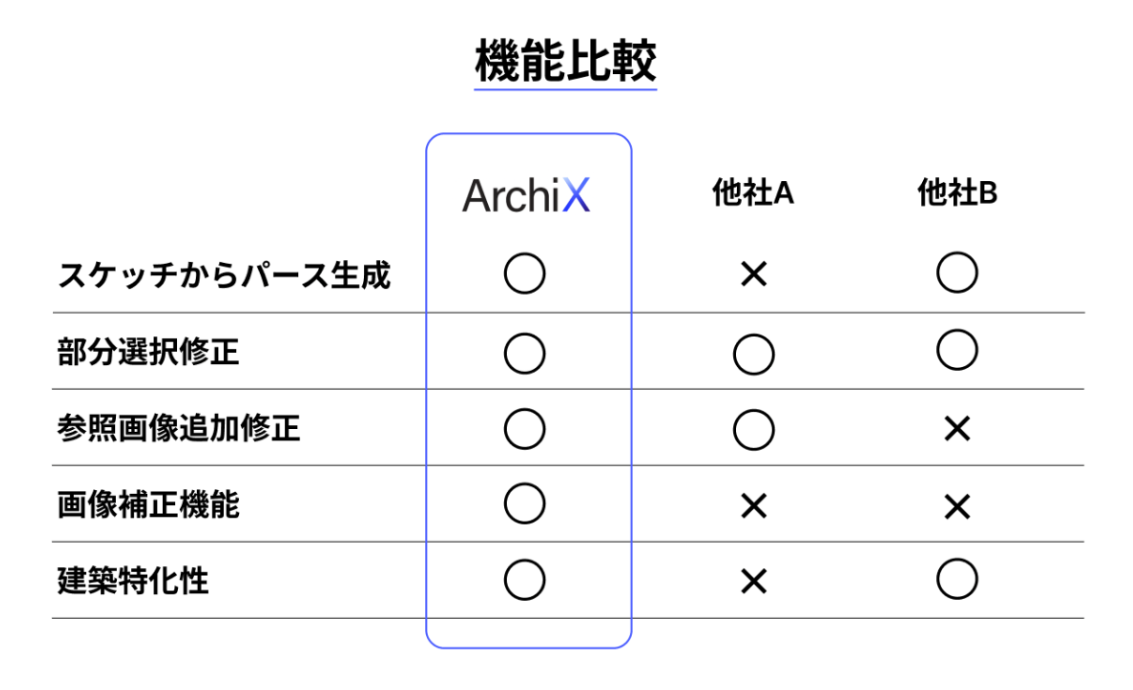 アーキエックスは、「スケッチからパース」「パースから動画」「AI議事録・要約」「アーキチャット」の4つのAI機能をひとつのアカウントでご利用いただける建築特化型AIサービスです。