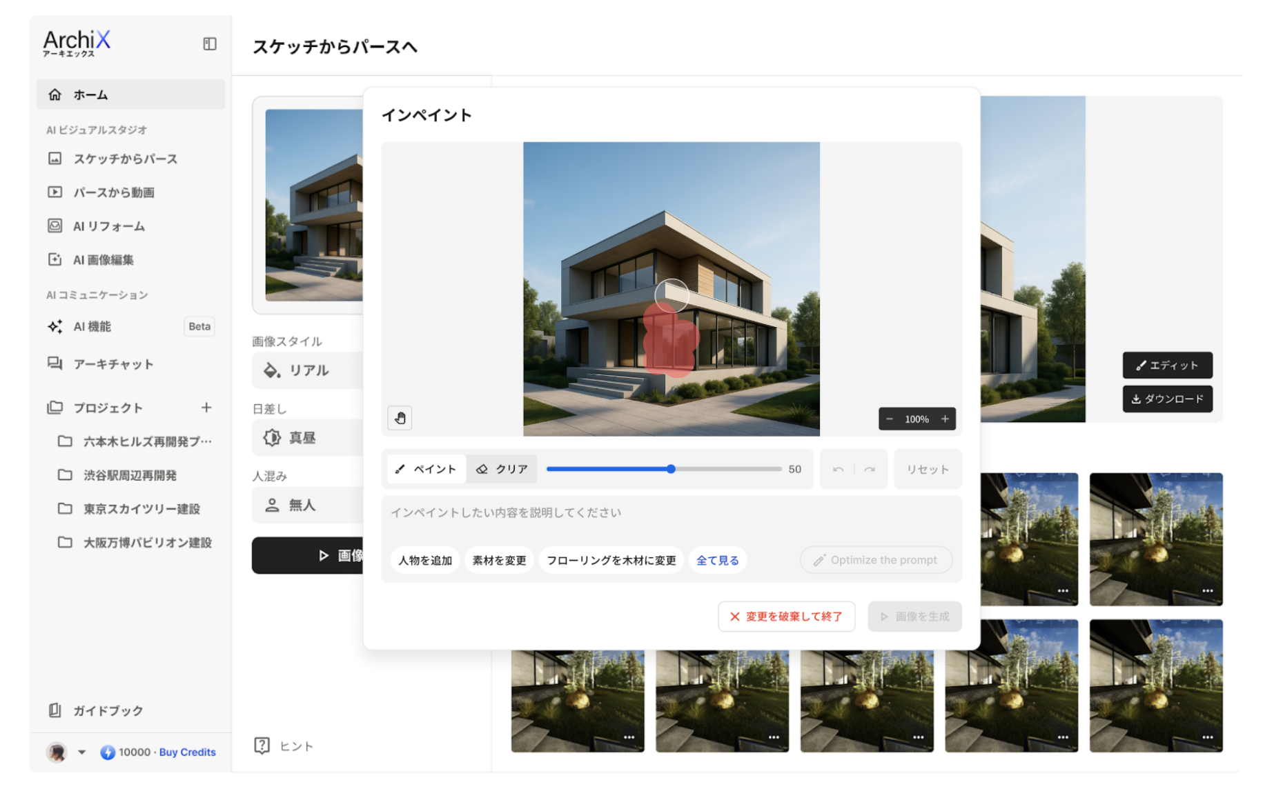 アーキエックスで生成したパースの修正したい画像の特定のエリアをブラシで選択し、プロンプトで指示するだけで、画像の一部を置き換えたり修正することができる機能です。操作例: