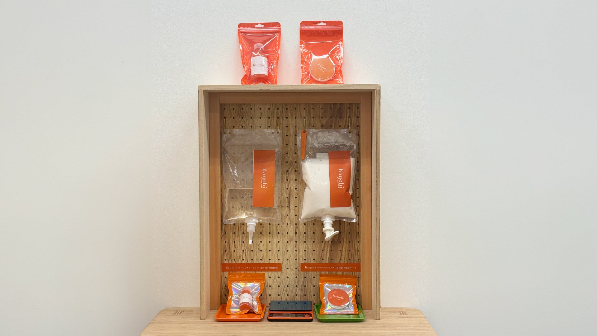 開発中の量り売り美容液「Kayohi ベーシックエッセンス」の展示