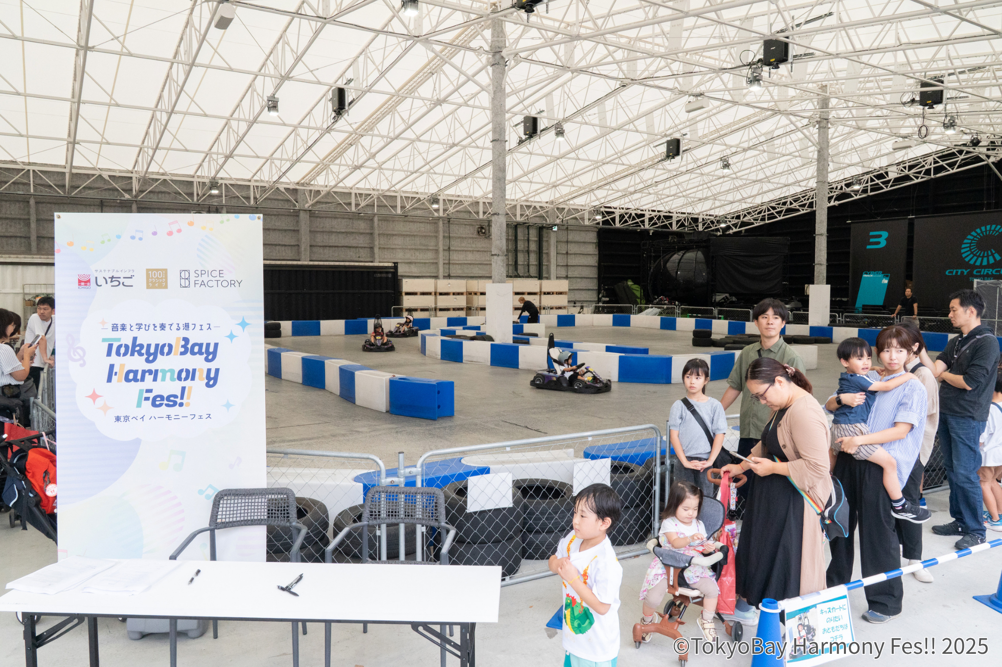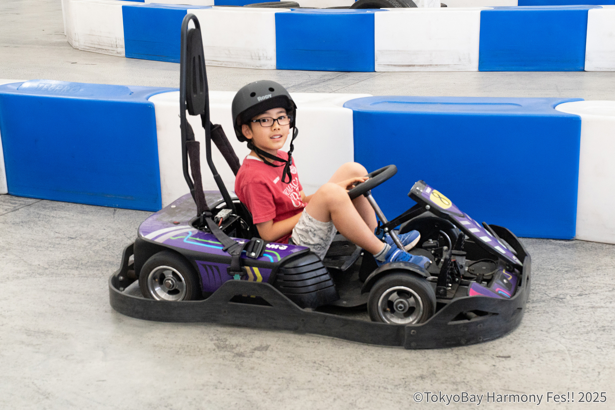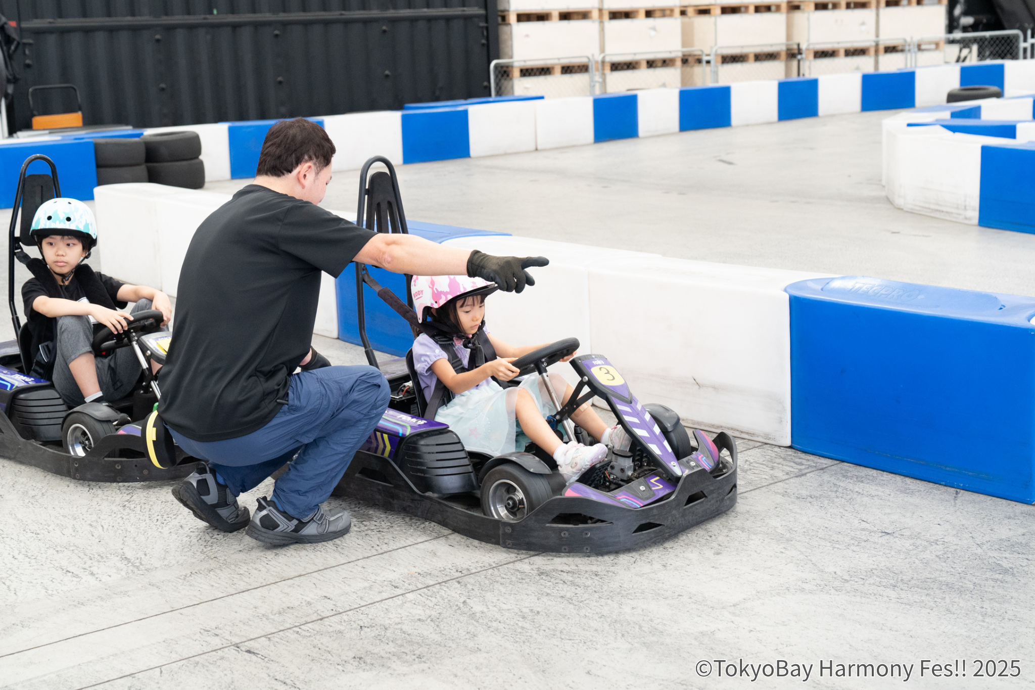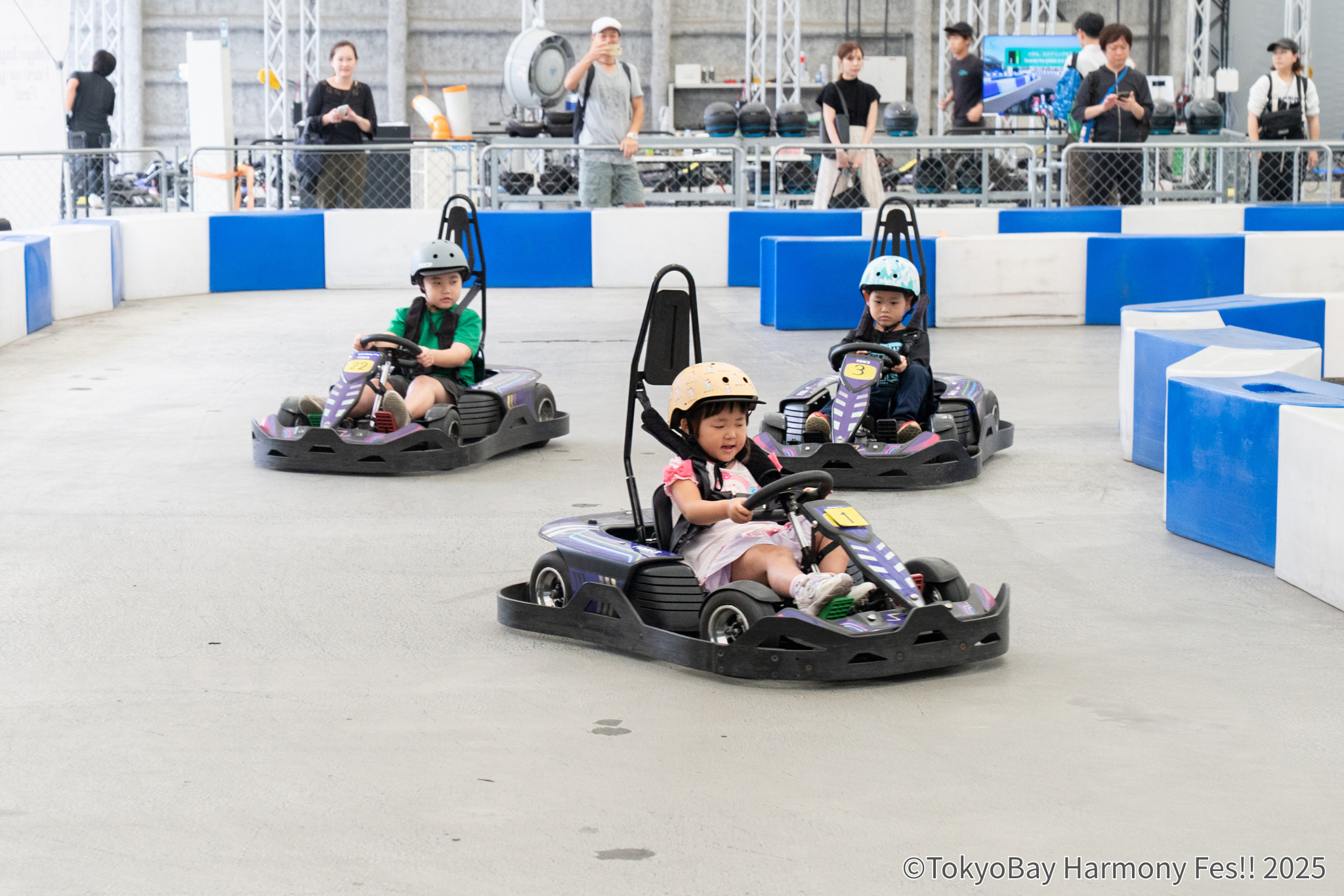 シティーサーキット東京ベイは、お台場に誕生した東京23区唯一のカートコースです。東京ベイ ハーモニーフェスのプログラムでは、子ども用EVカートの試走で、新たな都市型モビリティの体験をお届けしました。ヘルメットを付けて最初は少し緊張気味の子どもたちも、コースを運転すると「上手にできた!」と満面の笑顔を見せてくれました。