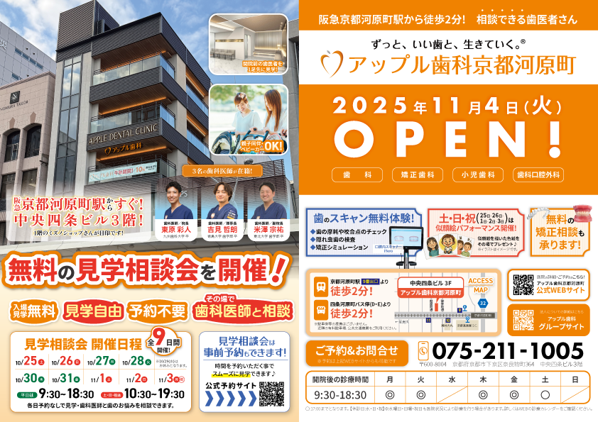 【京都にアップル歯科】2025年11月4日に京都河原町に新しい医院を開院!|10月25日~11月3日に相談できる見学・相談会、無料矯正相談会を実施。