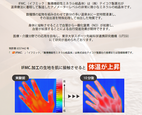 「着るサプ」は、高齢者の衣類の着脱の困りごとと健康のサポートを目指すことでウェルビーイング向上に貢献する当社オリジナルブランドです。健康を支える「サプリメント(SUPPLEMENT)」と驚きを提供する「サプライズ(SURPRISE)」という二つの「サプ」を着用者に届けたいという想いに由来しています。2022年、新型コロナ禍を契機にウェルビーイングの向上を目指して開発を開始しました。日本古来の温泉療法に着想した独自素材「IFMC.」※を採用し、血行促進効果が期待できます。また、着脱のしやすさや日常のお手入れ性にも配慮し、高齢者が快適に過ごせる機能性を追求した商品です。
