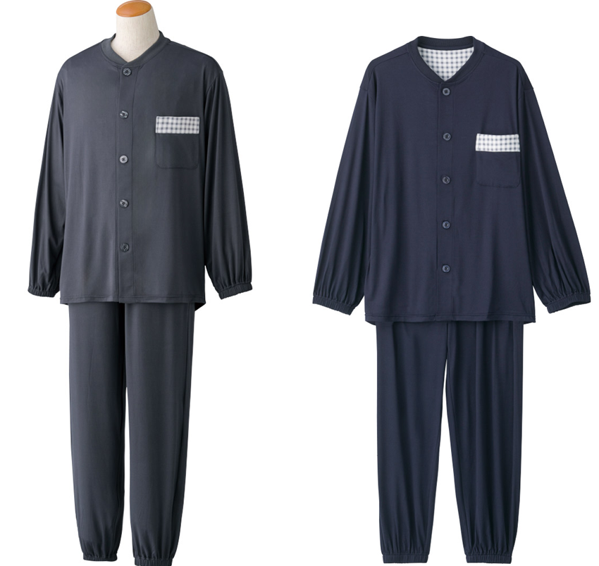 ルームウェアのようなデザインで寝る時間以外でも着用いただけます。ウエスト調節ゴムに加えて、手口、足口もゴム交換可能でお好みの長さに調節が可能。豊富な6サイズ(S~4L)展開で、ネイビー・チャコールの2色展開です。