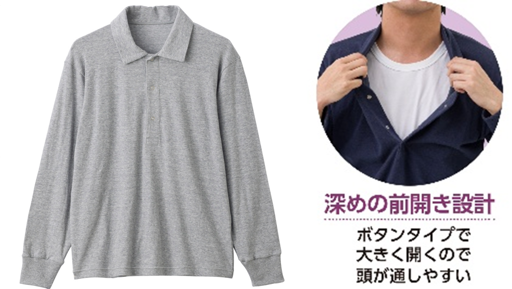 「NOBI AID(ノビエイド)」は、加齢や拘縮・麻痺などで更衣困難な方のお声をもとに企画開発した当社オリジナルブランドです。ブランド名には「伸びる(NOBI)ことで着脱を助ける(AID)」という想いを込めています。リハビリ病院や介護施設での試作・試着から、生地の突っ張りが着脱の大きな障壁であると判明し、伸縮率160%以上を実現する商品を開発しました。首・袖口の開口部を広げると同時に、その伸縮性が身体への過度な圧力とならないよう配慮し、着用後の見た目も大切にした設計です。着心地の良い風合いや柔らかさと一部乾燥機対応を備え、日常のケア性にも優れた商品に仕上げています。
