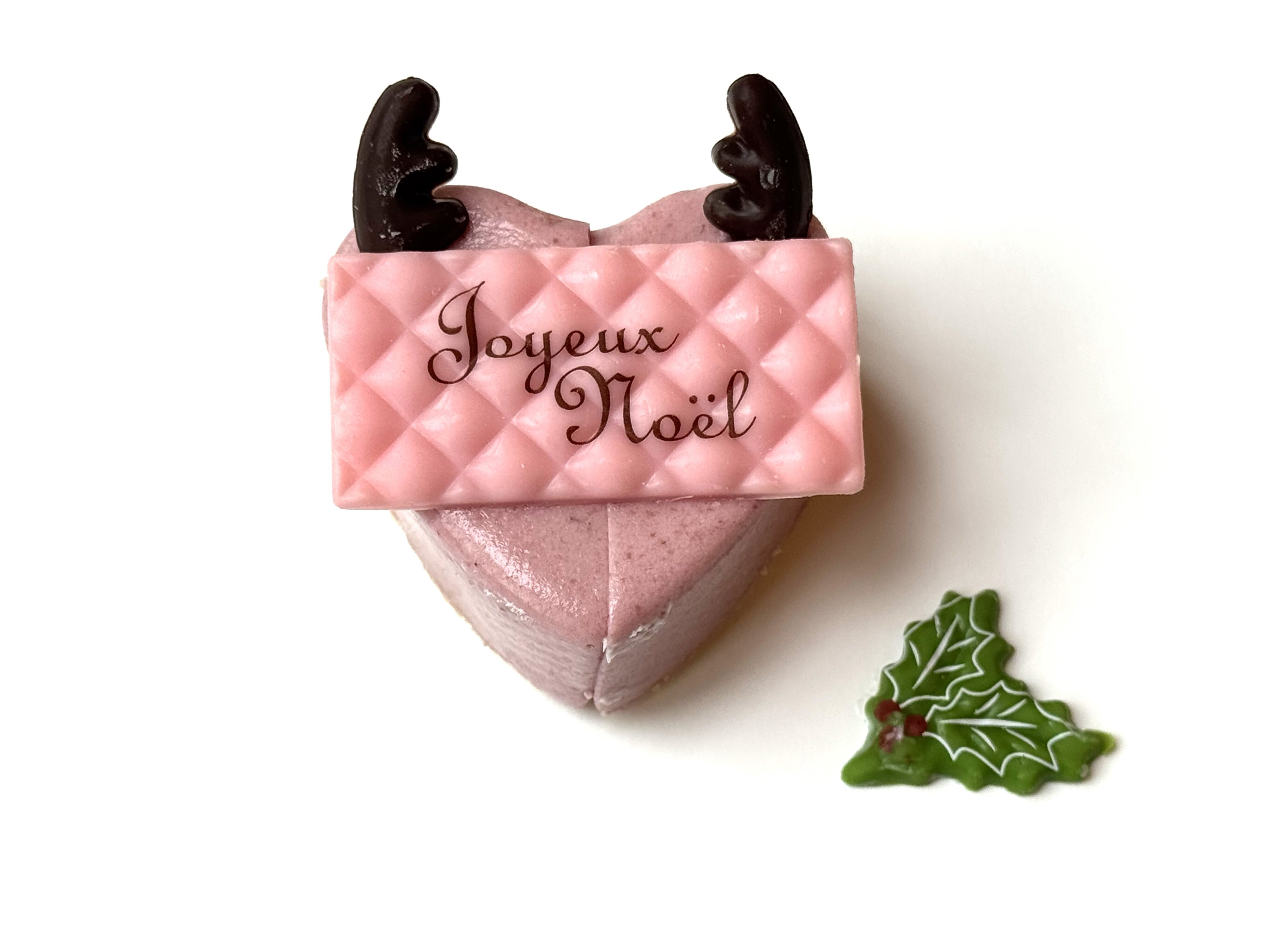 苺の甘酸っぱい香りがふわりと広がるハート型のムースを、トナカイのように愛らしくデコレーションしました。