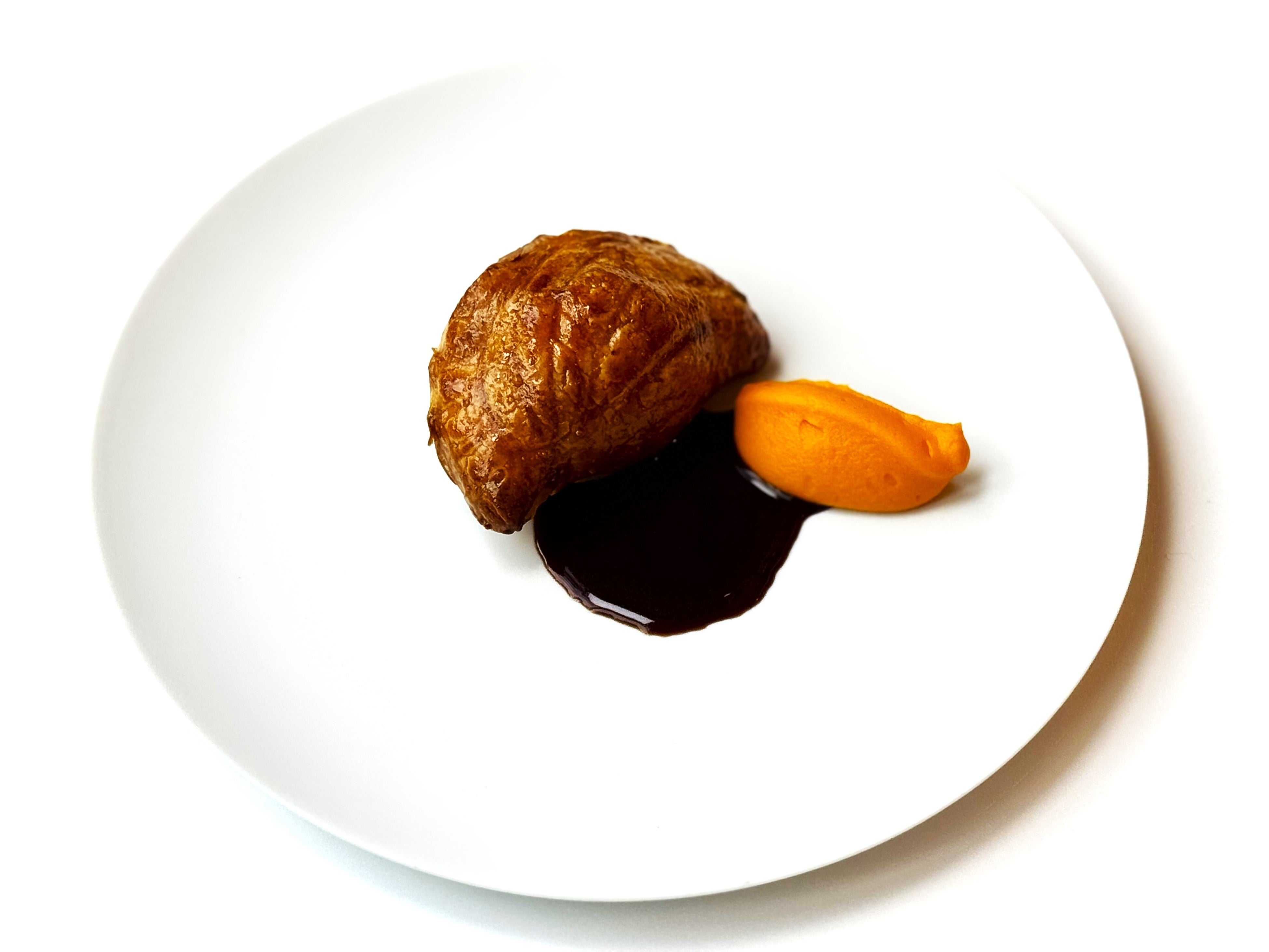 ■PICKUP■冬の贅沢を包み込んだ一皿「牛頬の赤ワイン煮のパイ包み焼 人参のピューレ添え」じっくりと赤ワインで煮込み、ホロホロとほどけるほど柔らかく仕上げた牛頬肉を、