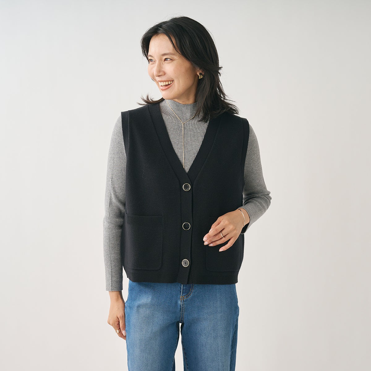 シャツやロンTとのレイヤードがしやすく、着回しの幅が広がるベスト。