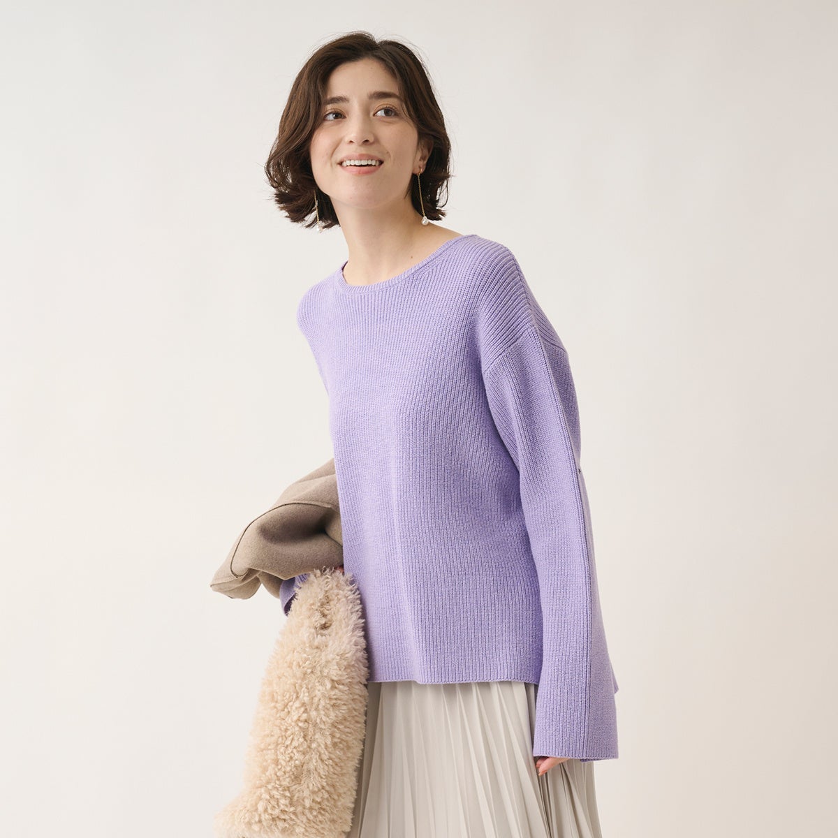 片畦編みの表情がシンプルすぎず、程よいゆとりのあるシルエットが、きれいめにもカジュアルにも