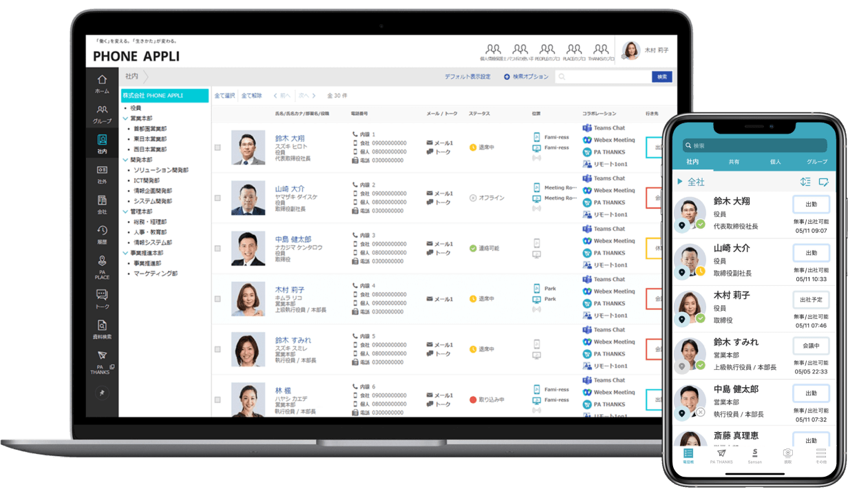 PHONE APPLI PEOPLEは、名刺・Web電話帳の連絡先を集約し、コラボレーションの起点となるコミュニケーションポータルです。