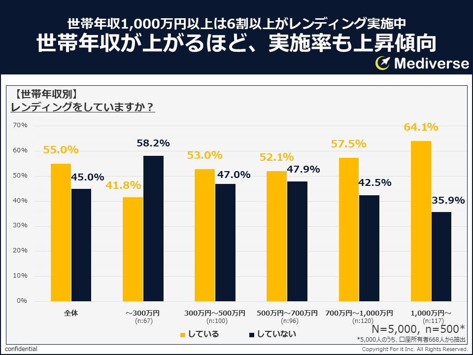 世帯年収別に見ると、レンディング実施有無には、世帯年収差が見られた。