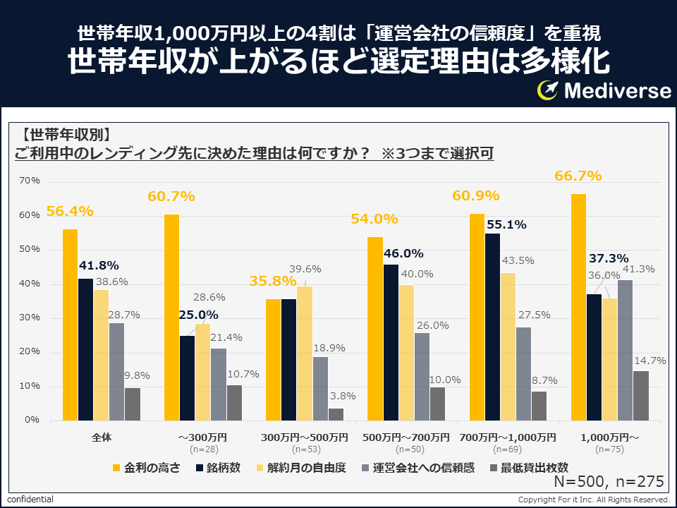 また、レンディング先の選定理由においては、「金利の高さ」を重視しつつも、高年収層ほど「解約月の自由度」や「運営会社への信頼感」といった付加価値を重視する傾向が見受けられました。