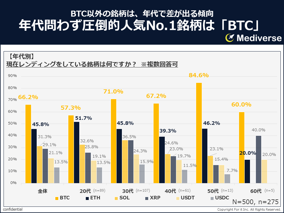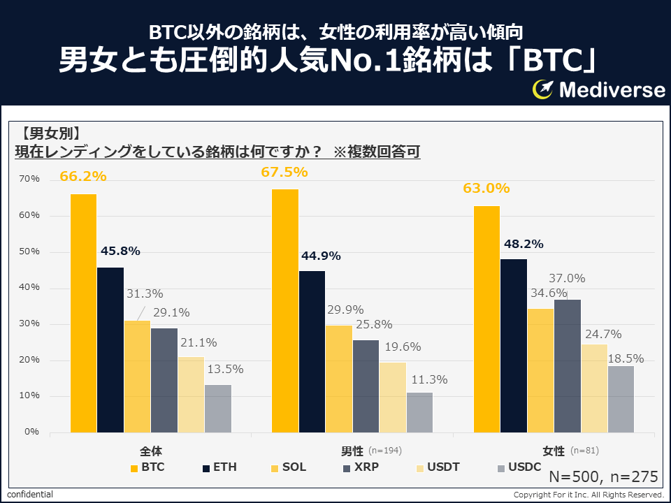 男女とも「BTC」が首位であり、「BTC」のみ男性が女性を上回っていたが、「ETH」「SOL」などその他の銘柄に関しては、いずれも女性の利用率が男性より高いことが垣間見える。