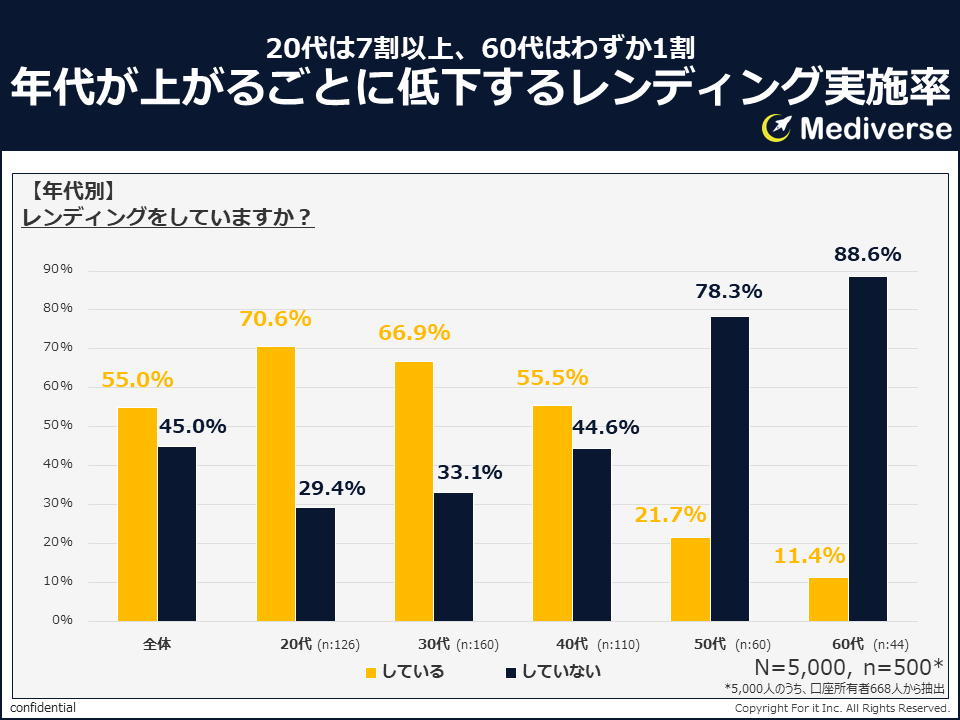 年代別に見ると、レンディング実施有無には、年代差が見られた。