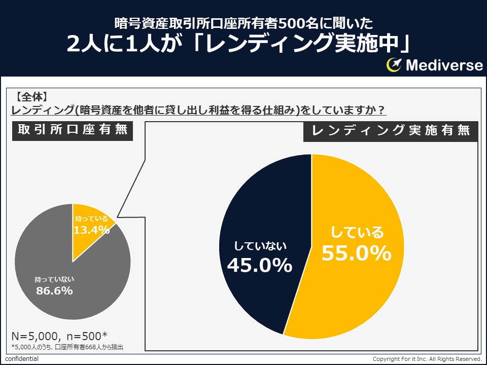 暗号資産口座(仮想通貨口座)保有者500名に対して、レンディングを実施しているか聞いたところ、半数以上が「実施している」と回答していた。