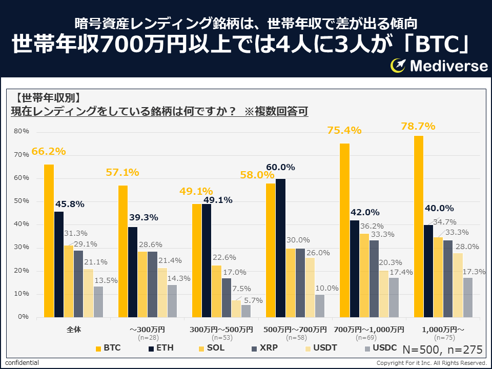 とりわけ世帯年収700万円以上の世帯年収層においては、4人に3人以上が「BTC」を注視していることが際立っていた。