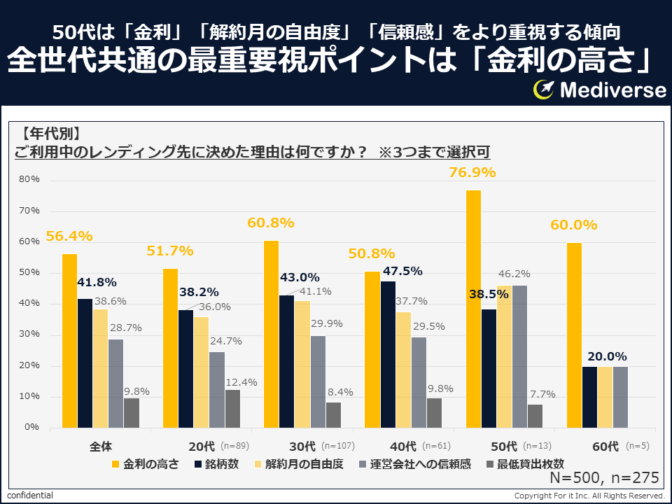 すべての年代において、「金利の高さ」が重要視されており、とりわけ50代においては8割近い割合(76.9%)を占めていた。また、「解約月の自由度」と「運営会社の信頼感」の比率がもっとも高かったのもこの年代である。