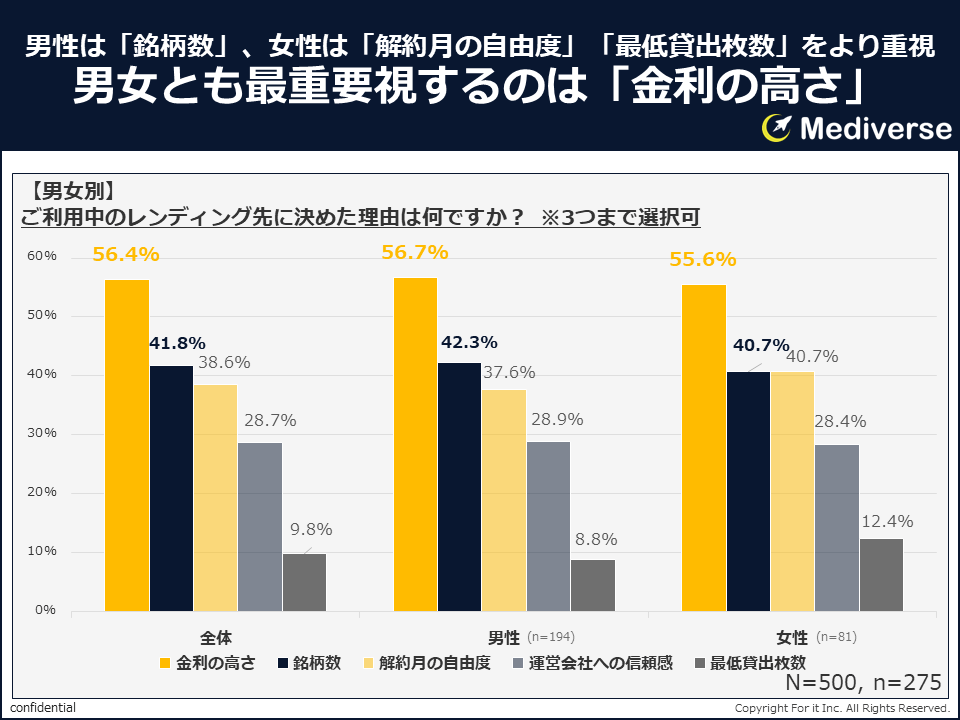 男女ともに半数以上が「金利の高さ」を最重要視しているが、男性は女性より「銘柄数」「運営会社の信頼度」を重視し、女性は男性より「解約月の自由度」と「最低貸出枚数」を重視する傾向が見られていた。