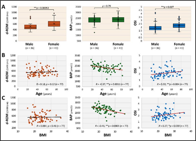 図. コロナ後遺症患者における酸化ストレスマーカーの性別、年齢、BMIによる特徴