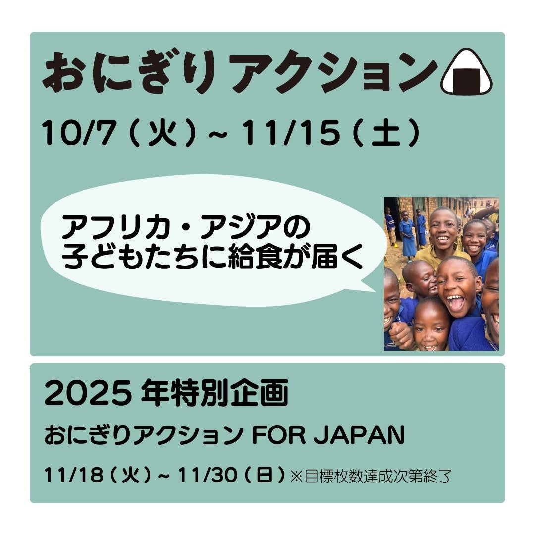 世界食料デーを記念したキャンペーンが初の国内支援を実施。FOR JAPANでは、期間中の「おにぎり写真」投稿5万枚達成を目標とし、達成後はドコデモこども食堂を通じて日本のこどもたちに食事チケットを届けます。