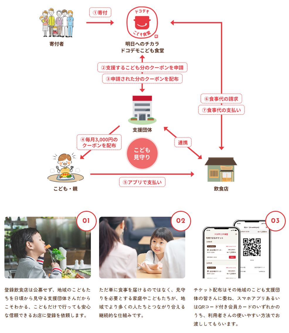 子どもたちはスマートフォンアプリや専用カードで月3,000円分のデジタル食事チケットを受け取り、好きな店で好きなメニューを選んで食事できます。