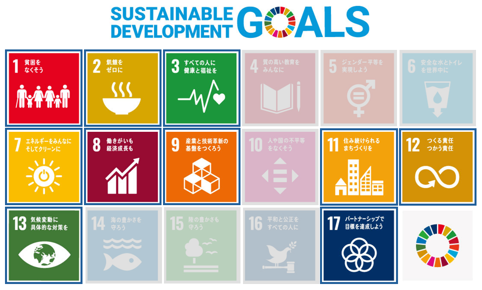 最先端の技術で社会の持続可能性を高めていくとともに、社内でのフードドライブ活動やエコキャップ活動といった社会貢献活動を通じて、SDGsの17のゴールのうち、主に以下の目標達成に向けて取り組んでまいります。