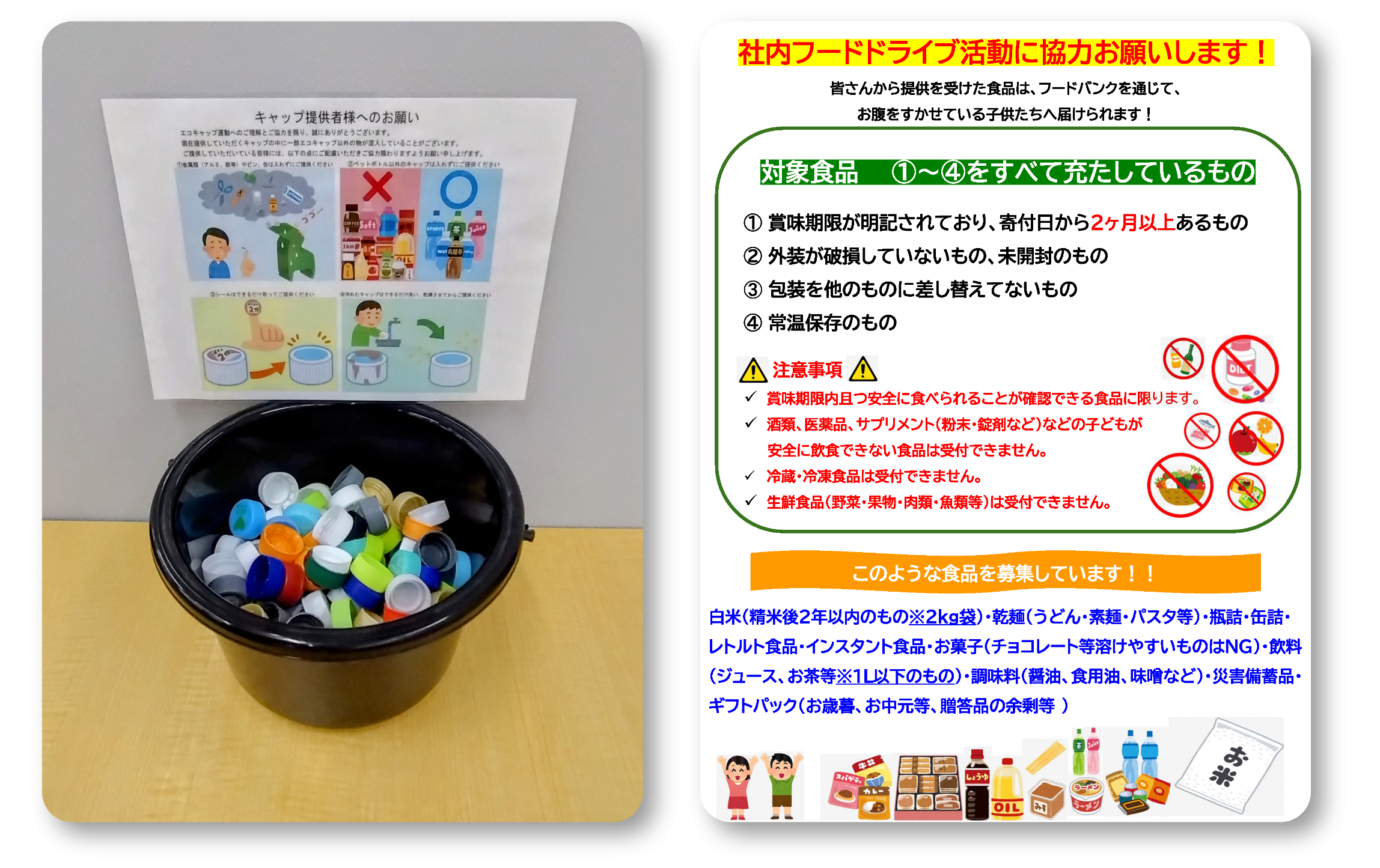 ISO14001(EMS:環境マネジメントシステム)の年間目標及び社会課題解決に向けたSDGsの取り組みとして、フードドライブ活動を継続するとともに、2025年度は、ペットボトルキャップの回収・リサイクルを推進する「エコキャップ活動」に取り組んでまいります。