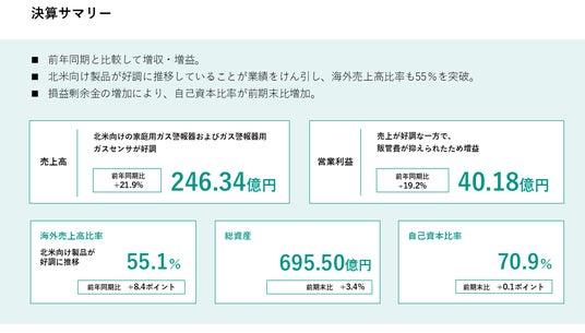 2026年3月期第2四半期については、北米向けの家庭用ガス警報器およびガス警報器用ガスセンサが好調に推移したことにより、売上高は前年同期比21.9%増の246億34百万円となりました。