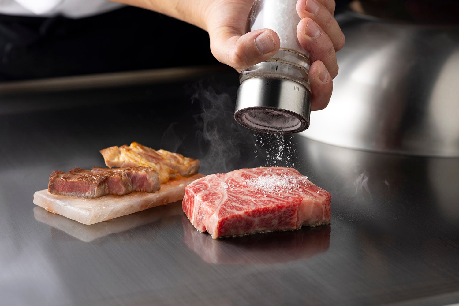 岩塩プレートで仕上げる岩手県産プラチナポークといわて短角牛