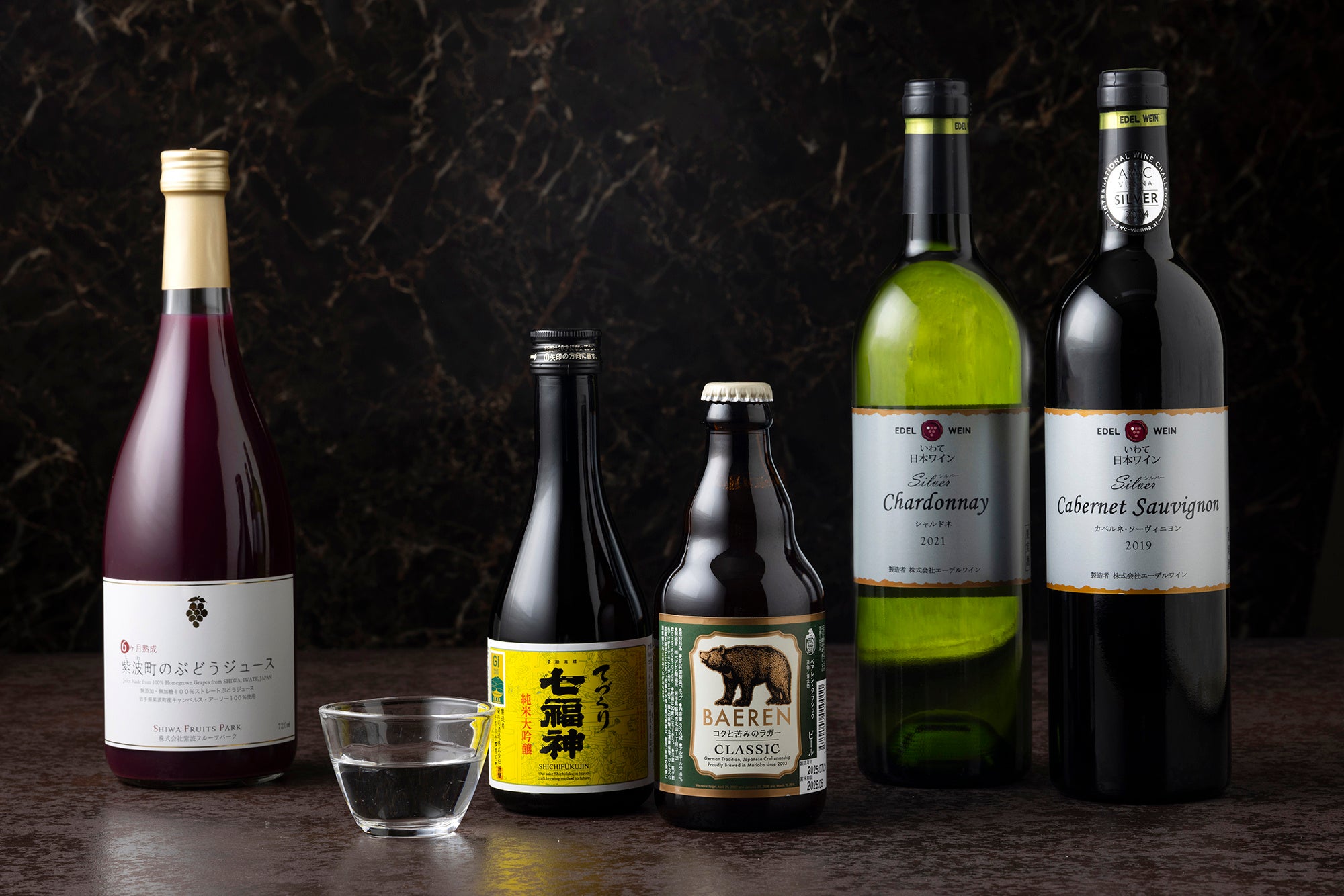 岩手県では、「南部杜氏」が受け継ぐ日本酒に加え、清らかな水と冷涼な気候を活かした多様な酒造りをしています。地元のぶどうを使ったワインや、さまざまなクラフトビールも人気があり、多彩な味わいをお楽しみいただけます。料理とのマリアージュを考えて揃えたお酒ですので、お食事と一緒に味わうひとときをお過ごしください。