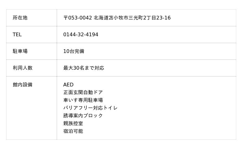 JR苫小牧駅から車で7分、苫小牧中央ICから車で5分とアクセスも良く、10台の駐車場を完備した利便性の高いホールです。