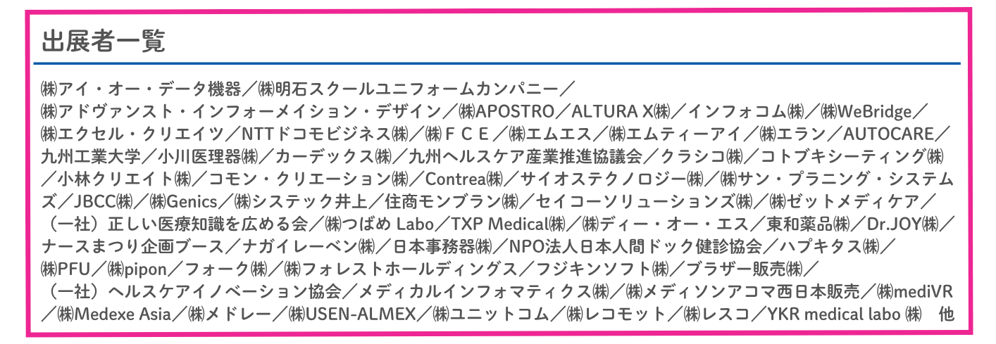 出展製品サービス:医療情報システム、医療機器、健診・健康増進、看護、施設環境・運営サポート、介護・福祉・リハビリ