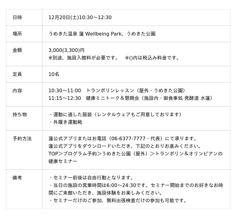 「うめきた温泉 蓮 Wellbeing Park」(総支配人:藤立 達哉、所在地:大阪市)は、2025年12月20日に、オリンピアン 廣田 遥さんをお迎えし、うめきた公園でのトランポリンレッスンと健康ミニトーク、懇親会をセットにしたイベントを開催することをお知らせします。