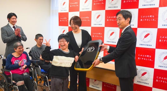 長年にわたり、京都府の障害のある方へのご支援を賜り誠にありがとうございます。また、この度の車両贈呈につきましては、MKグループ様、神戸トヨペット様をはじめ大会関係者の皆様方に特段のご配慮を賜りましたこと重ねて感謝申し上げます。