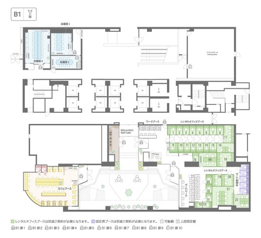 設備:Wi-Fi、フリードリンク、無料プリンター、ロッカー、ポスト、登記可、会議室、WEB会議用個室、イベントスペース、BIZcomfort Self Cafe、コンシェルジュ