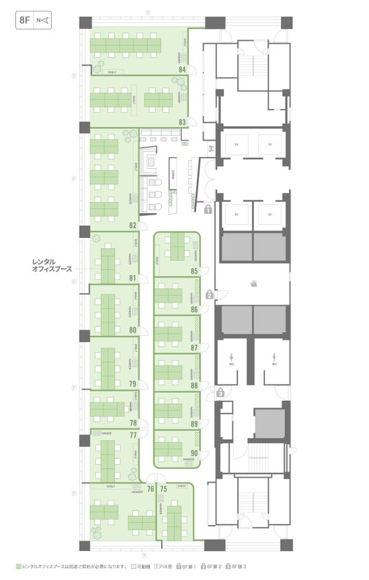 8階に4~12名向けのレンタルオフィスを16戸新設し、オフィスに必要な家具・インターネット環境・什器類の設備をあらかじめ完備。一般オフィス契約で発生しがちな敷金・礼金などの初期費用は不要、また、内装費や設備工事費を削減することが可能です。さらに、同フロアに8階契約者専用のラウンジを併設し、来客対応や休憩場所をご提供します。